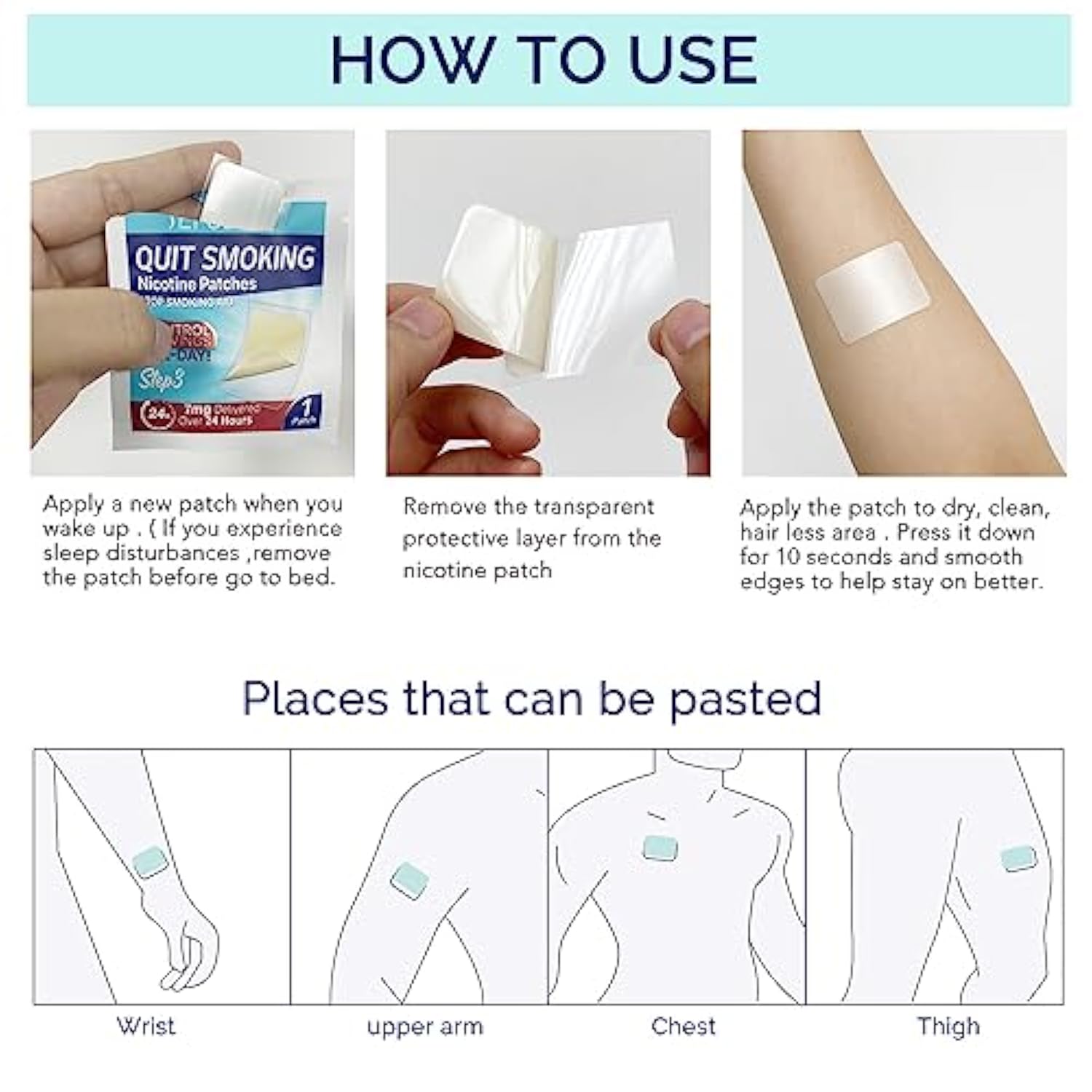 • All Day Aid for Quit Smoking: Aroamas Nicotine Patches are designed to give you 24 hours of support by each patch. Apply one new patch every 24 hours on skin that is dry, clean and hairless. Remove backing from patch and immediately press onto skin.