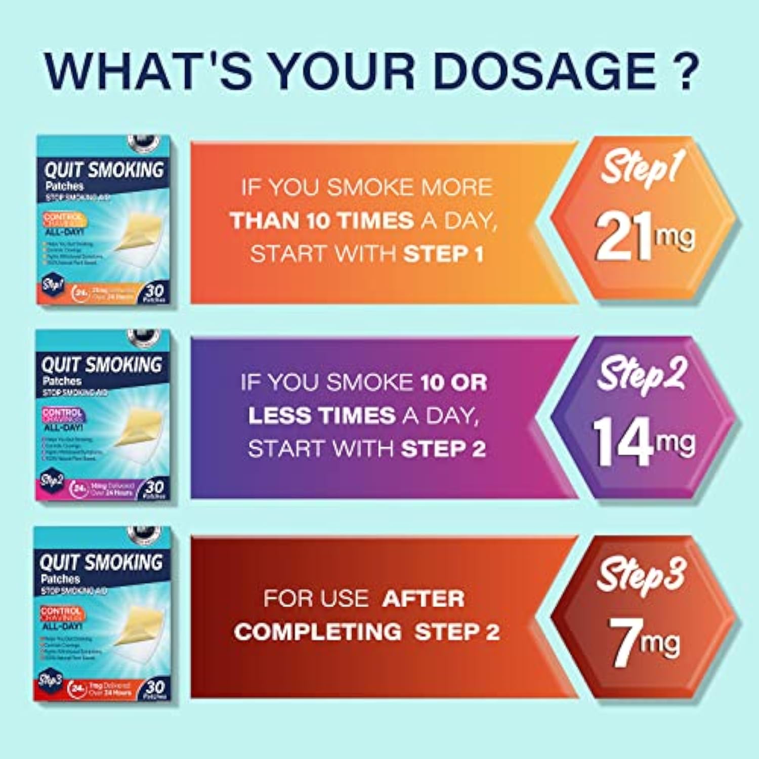• Personalized Program : Aroamas Nicotine Patches offer a 3 steps down approach to stop smoking over an 8-10 week period. Beginning with the 21 mg patch(Step 1) if you smoke more than 10 a day.
