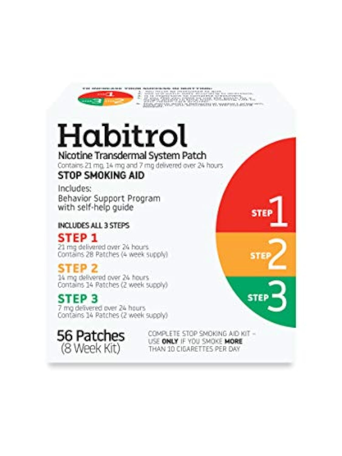 • Habitrol Nicotine Patches come in three decreasing nicotine levels. During our 8-week step-down program, you’ll work your way through these steps, gradually reducing your nicotine dependency and improving your chances of quitting.