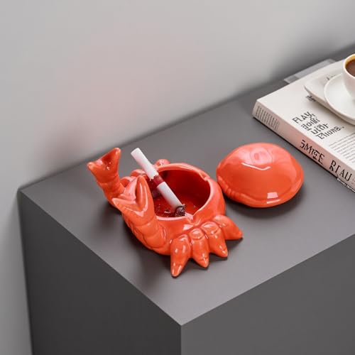 Ashtray with Lid, Windproof Tabletop Ceramic Cigarette Ash Tray for Outside or Inside, Crab Decor