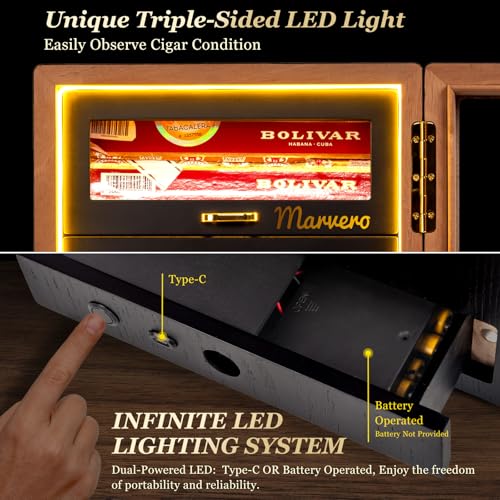 ăTRIPLE-SIDED LED LIGHTă: The infinite LED lighting system make it easier to observe the condition of the cigar. There has an LED light bottom on the back and features with Dual-Powered System: Type-C or Battery Operated, experience the convenience of portability and reliability (Battery not Provided)