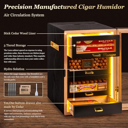 ăQUALITY MATERIALSă: The natural cedar wood liner imparts a refreshing wood aroma, maintaining moisture and freshness for your cigars. A durable tempered glass door allows easy observation of humidity levels while ensuring comprehensive protection for your cigar collection