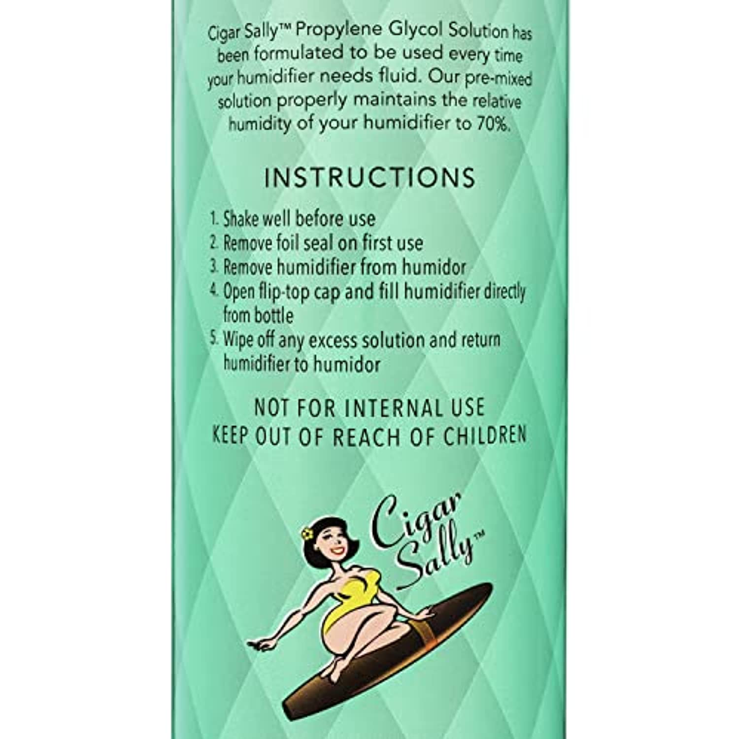 Cigar Sally Cigar PG solution has been formulated to be used every time to refill humidifiers. Our PG solution is mixed with 99.9% Propylene Glycol and Triple Distilled water. Our solution maintains a 70% RH within your humidor.
