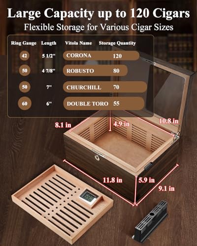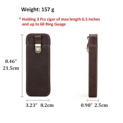 Capacity: 8.46 x 3.23 x 0.98 inches, 21.5 x 8.2 x 2.5 cm(L x W x D). Brown cigar organizer cigar travel bag for men can hold 3 pcs cigar of max length 6.5 inches and up to 60 RING guage