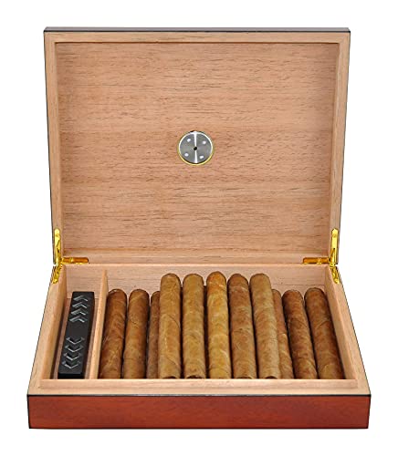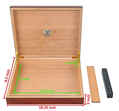 Golden hygrometer on the top for easy reviewing humidity, handmade secure seal on closure, according to manual, filling humidifier, observing hygrometer, to create a moisture retention system, keep your cigars fresh for ages. (Cigars do Not Included in packaging).