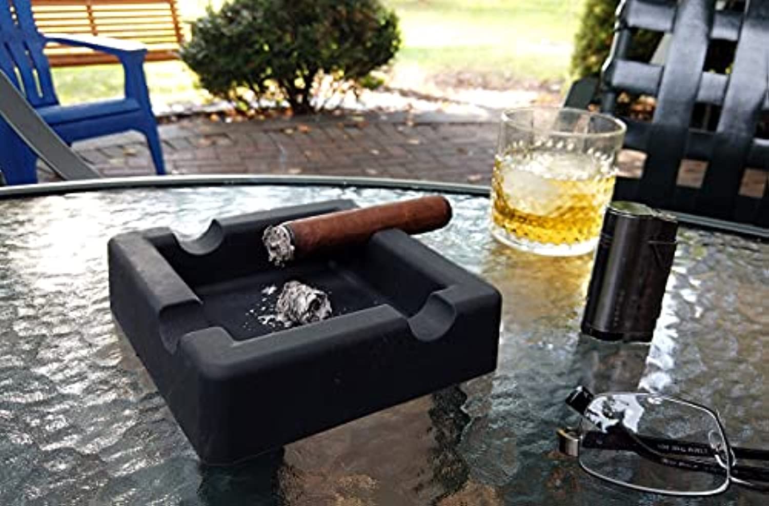 UNBREAKABLE! Our silicone cigar ashtray can withstand endless afternoons and evenings of smoking! The sturdy, flexible and heavy silicone material won’t break, slip, or damage your table top. Unlike ceramic and glass cigar ashtrays, this will not shatter when it is dropped. Our product is easy to clean! Simply dump the ash out and rinse under water! You can keep this outside all year round in all weather conditions – through the summer heat and the winter deep freeze!