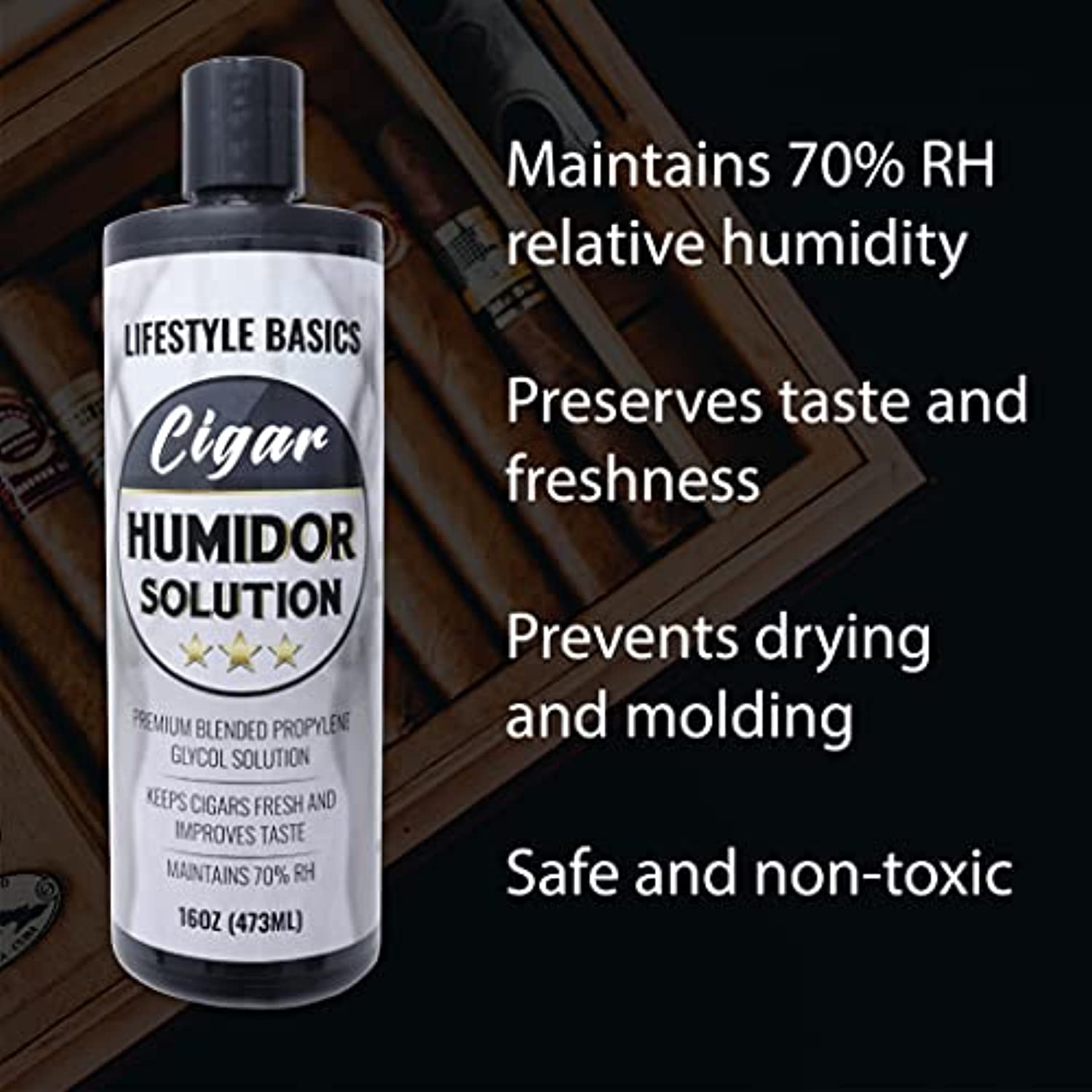 Lifestyle Basics Premium Cigar Humidor Solution Lifestyle Basics Premium Cigar Humidor Solution is the only product you need to keep your cigars fresh and in best smoking shape! Our proprietary propylene glycol blend maintains a steady 70 Percent RH relative humidity, meaning that your cigars stay in perfect condition without drying out or getting too moist. Make sure that you get the best out of your collection by using our best in class humidor solution! DIRECTIONS: Shake well before use. Remove humidifier from humidor. Fill humidifier with Lifestyle Basics Cigar Humidor Solution. Remove any excess solution from humidifier. Return humidifier to humidor. 100 Percent SATISFACTION : We offer a superior product at a better price than our competitors. We that you will be fully satisfied with your purchase. If for any reason you are not fully satisfied we will be sure to make it right.