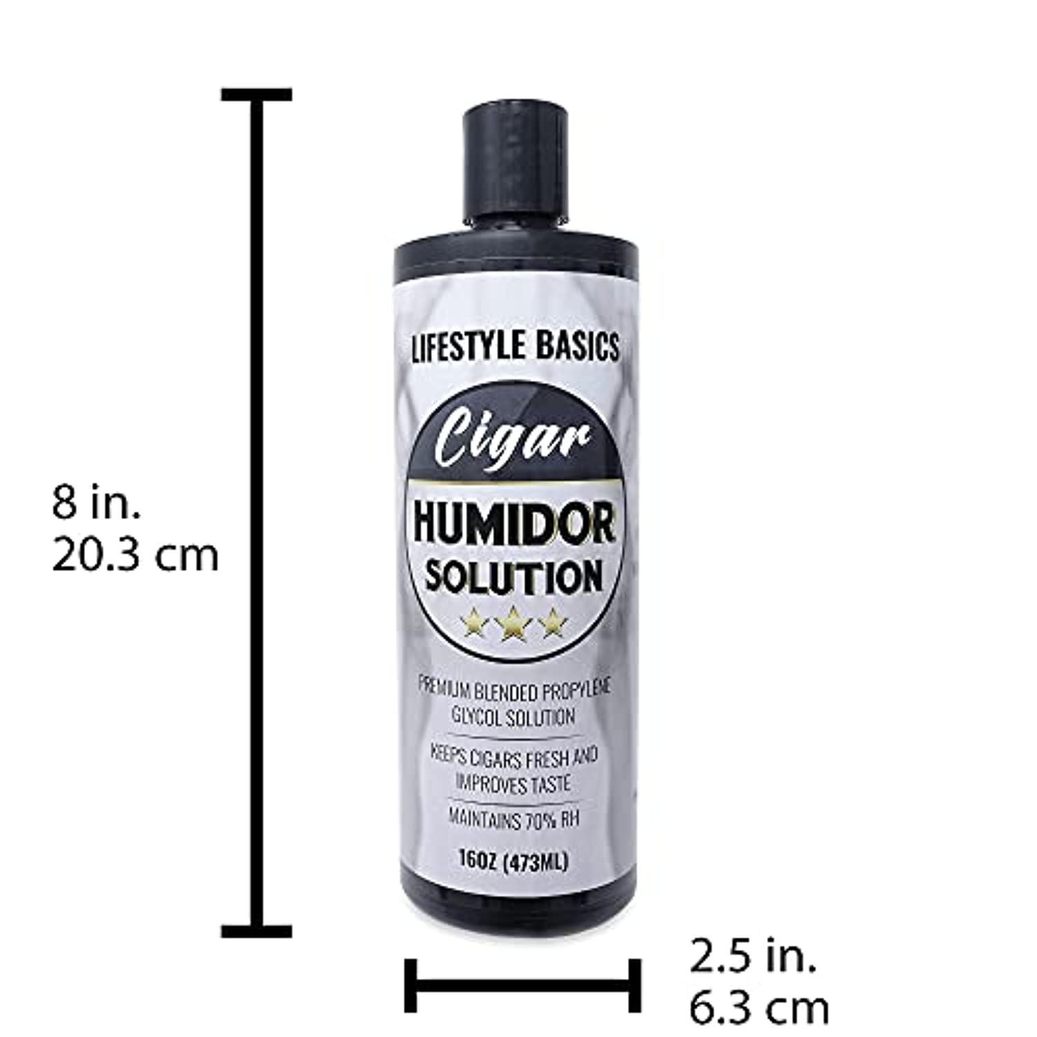 Lifestyle Basics Premium Humidor Solution Lifestyle Basics Premium Humidor Solution is the only product you need to keep your collection fresh and in its best shape! Our proprietary propylene glycol blend maintains a steady 70 Percent RH relative humidity, meaning that your humidor stays in perfect condition without drying out or getting too moist. Make sure that you get the best out of your collection by using our best in class humidor solution! DIRECTIONS: Shake well before use. Remove humidifier from humidor. Fill humidifier with Lifestyle Basics Humidor Solution. Remove any excess solution from humidifier. Return humidifier to humidor. 1100 Percent SATISFACTION : We offer a superior product at a better price than our competitors. We that you will be fully satisfied with your purchase. If for any reason you are not fully satisfied we will be sure to make it right.