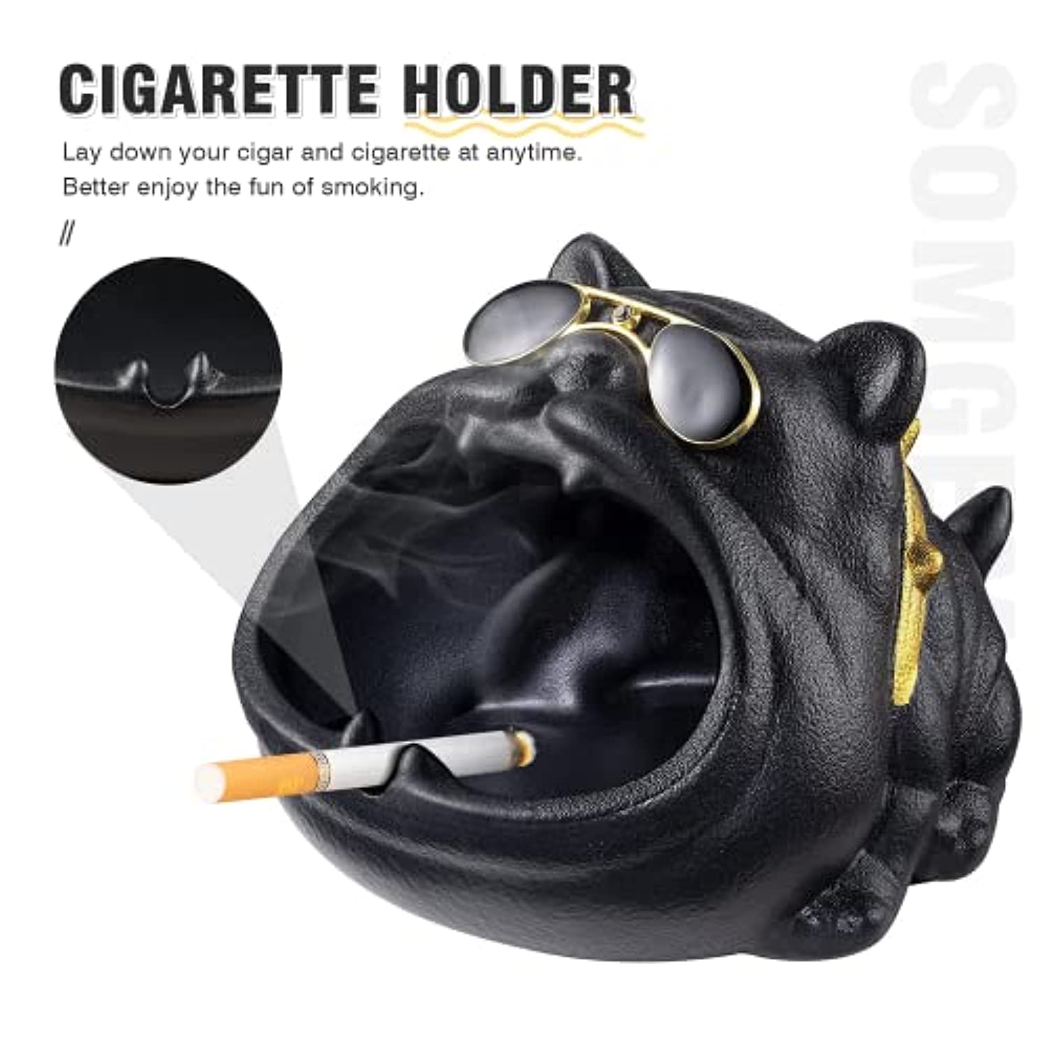 • 怐LARGE CAPACITY & CIGARETTE HOLDER The semi-enclosed design makes the capacity of this cool ash tray larger and deeper so that you can hold more tobacco ash and cigarette butts, effectively windproof. With a humanized groove, you can lay down your cigar and cigarette at any time. Easy to clean and the durable coating of our tray will not chip or fade.