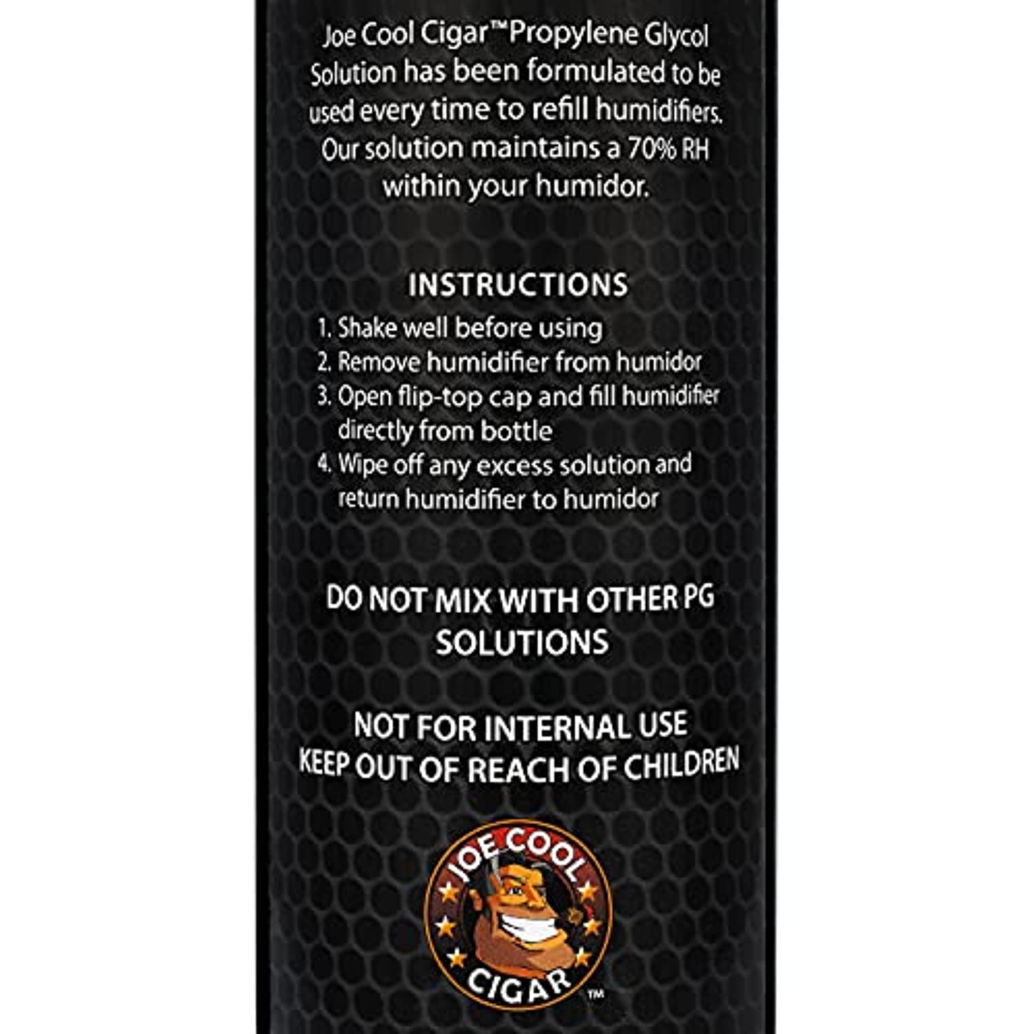 Joe Cool Cigar PG solution has been formulated to be used every time to refill humidifiers. Our PG solution is mixed with 99.9% Propylene Glycol and Triple Distilled water. Our solution maintains a 70% RH within your humidor.