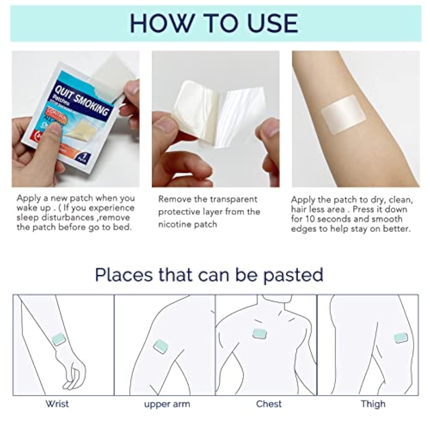 Take out a patch, remove the protective film and stick it on a clean, dry area. ( preferably wrist, upper arm, chest, thigh) Apply it in the morning and remove it an hour before going to bed. Avoid applying the patch in the same area consecutively, when replacing with new patch avoid over skin rash or irritated skin. Usage Reference: 2 Patches per day for the first week. (Simultaneous Use), 1.5 Patches per day for the second and third week, 1 patch per day for the fourth week and half a patch for the fifth week. (Appropriate increase or decrease according to the amount of smoke and body weight.) Warning: 1. Pregnant women, lactating women, heart disease, severe hypertension patients are recommended not to use this product. 2. For external use only and keep out of reach of children. 3. Smoking should be stopped during the use of the patches, avoid staying in a smoking environment for a long time. 4. If you feel dizzy, nausea etc. please remove the patch immediately and drink plenty of water. After you feel normal, you can reduce the dose and use again. 5. Do not use on Damaged Skin and wounds, if not comfortable please change the area of application. Package List: Quit Smoking Patches Step 1 (30 patch)