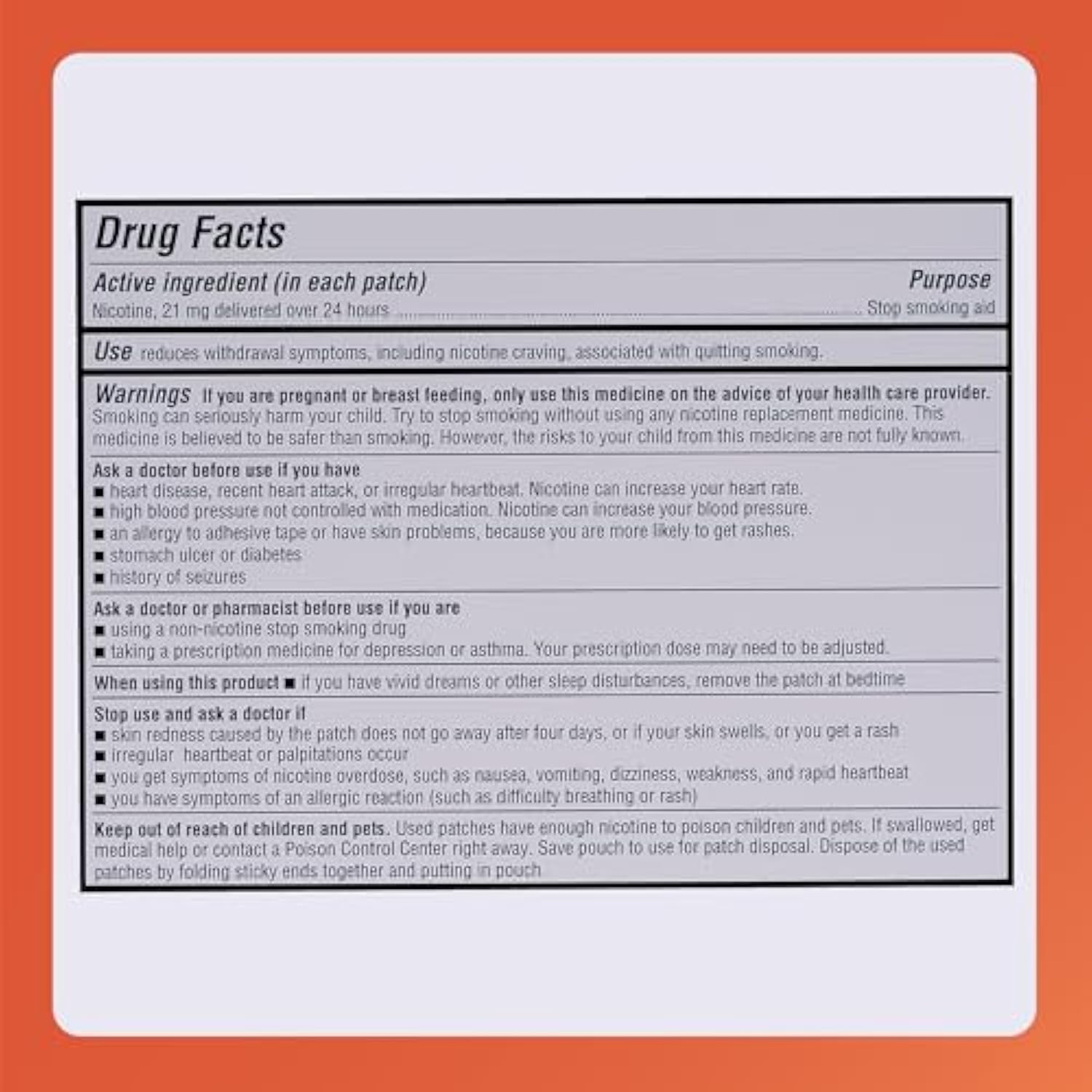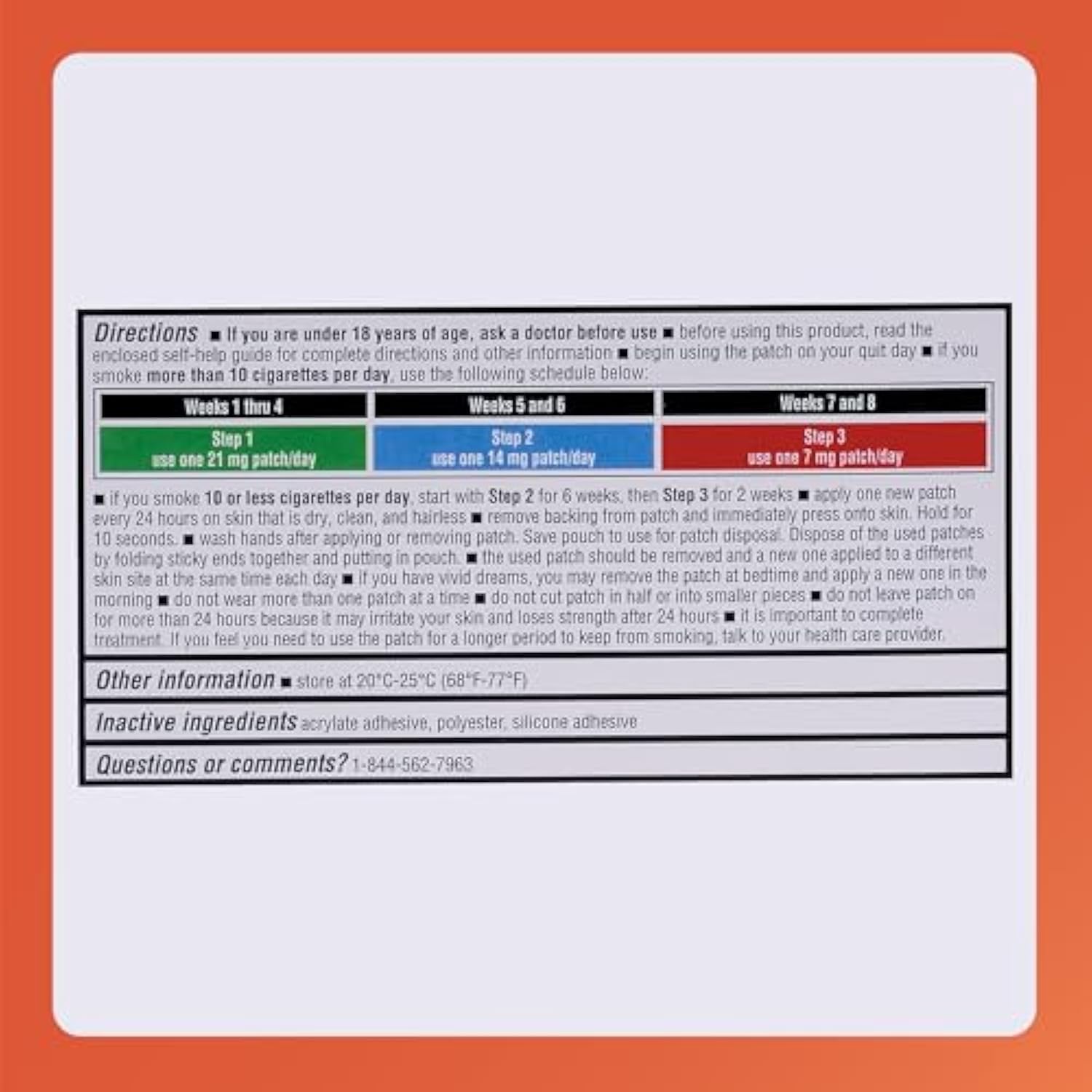 • CRAVING RELIEF: Our step one dermal patch is part of a three-step OTC nicotine replacement therapy. It contains 21mg of nicotine delivered to your system over 24 hours. Do not smoke even when not wearing the patch. The nicotine in your skin will still be entering your bloodstream for several hours after you take off the patch.