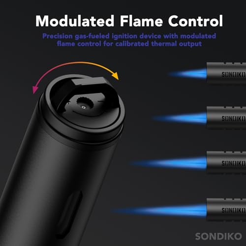 【Automatic Ignition & Refillable】 The unique ignition button is designed to free your hands. Simply press the button once to light the flame and burn continuously. Quickly refill the butane torch with any brand of butane in 5 seconds.