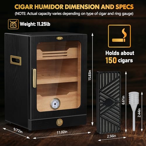 ăQuality MaterialsăThe liner made of natural cedar wood gives off a natural wood aroma, which not only moisturizes and breathes, but also keeps your cigars fresh and tasty. It’s also equipped with sturdy transparent tempered glass door, so you can observe the humidity changes inside the humidor cigar box while protecting your cigar collection in all aspects.