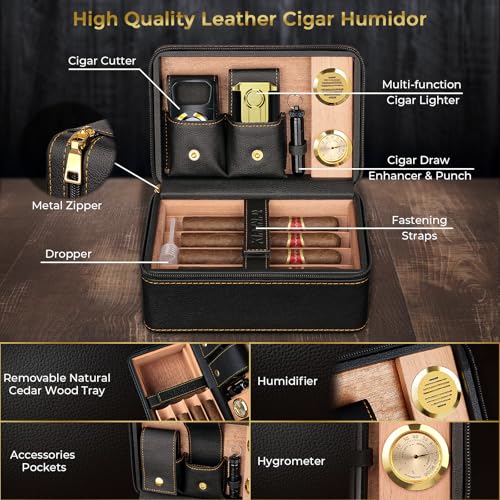 Travel Cigar Humidor Set, 2-Layer Design & CedarWood Lined, with Cigar Lighter Built-in V Cutter&Holder, Cigar Cutter, Draw Enhancer, Hygrometer, Humidifier, Portable Leather Cigar Case, Gifts for Men