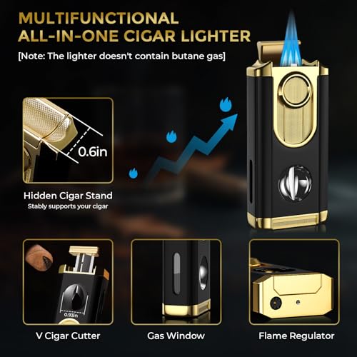 【Professional Cigar Accessories Set】We have prepared a complete kit of Multi-functional cigar accessories for you in our cigar box. The all-in-one cigar lighter perfectly combines a windproof lighter, a cigar holder, and a cigar v cutter that can cut 60-ring gauge cigars. The 2-in-1 cigar draw enhancer tool combines a punch with a cigar needle, catering to small-hole suction lovers. Considering the needs of more cigar users, we have also prepared a sharp cigar flat cutter to create a clean cut for you [Note: the lighter you purchased contains no butane gas]